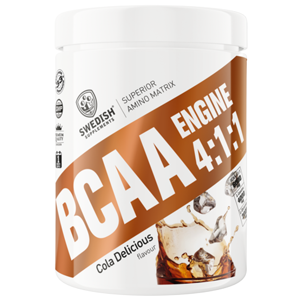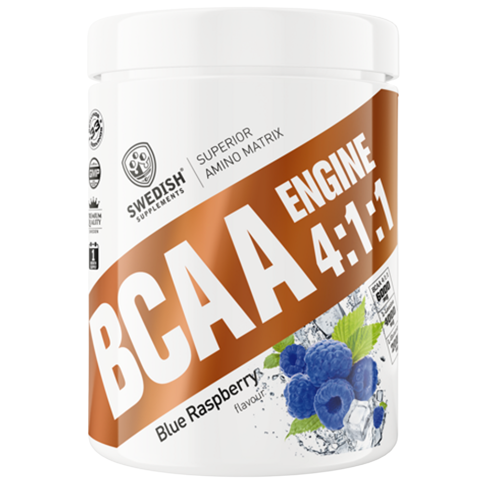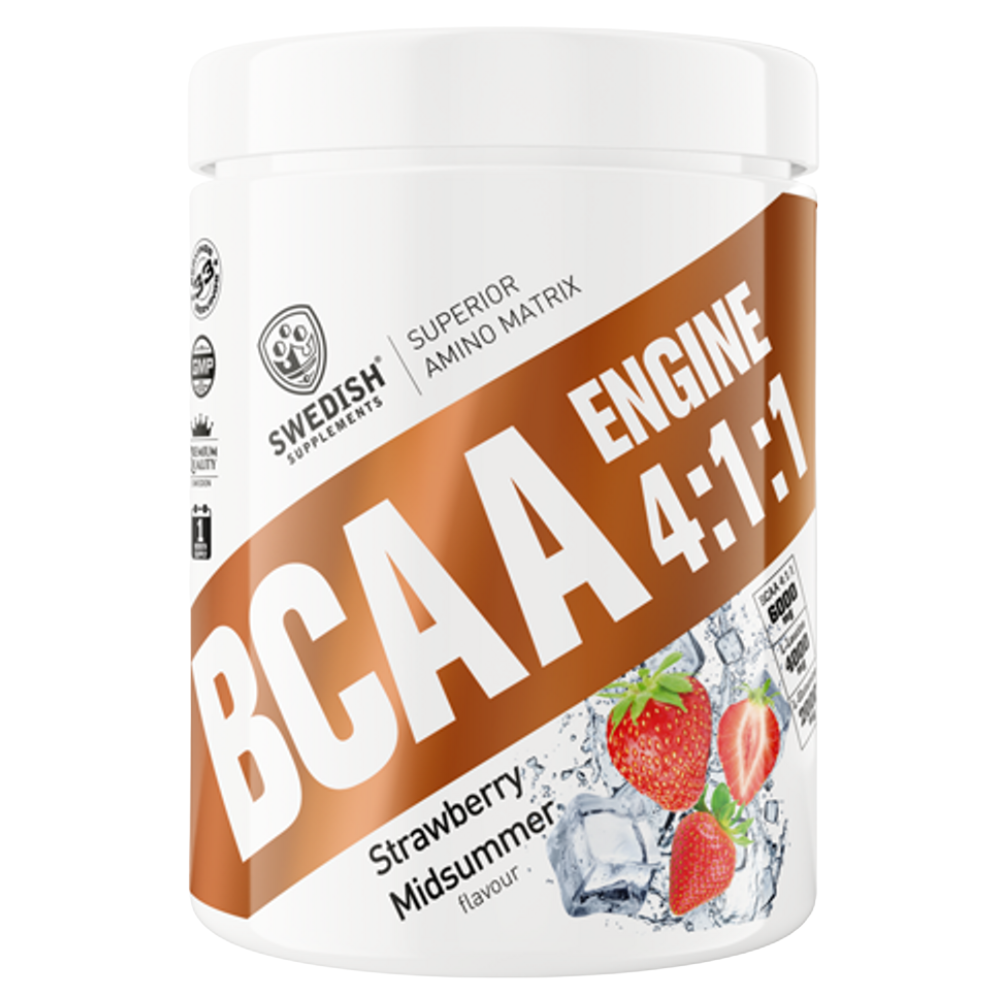 L-leucin, L-glutamin, L-valin, L-isoleucin, eplesyre , glycin, L-alanin, L-lysin, smaksstoffer , maltodekstrin fargestoff: E101, E162 (Juicy orange flavor). E162 (Rabarber dream, Watermelon mania flavor). E101 (Crazy mango, Lemon twist, Winegum candy, Hawaii Pineapple flavor). E101, E133 (Candy Cactus, Kiwi/Pear flavor) E101, E150c (Energy drink flavor). E150c (Cola delicious, Energy drink flavor). E133 (Blue Raspberry flavor). E120 (Strawberry midsummer flavor), søtstoffer: Aspartam, acesulfam-K. Inneholder en fenylalaninkilde.