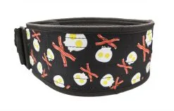 Beltet veier bare 300gr, er svart med egg & bacon-motiv med solid, bred borrelås og rød FlexFit-logo.