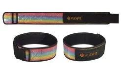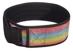 Beltet veier bare 300gr, er svart med regnbueglitter og solid, bred borrelås med rosa FlexFit-logo.