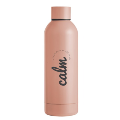 Størrelse: Ø7,5 x 22,5cm. Dobbelvegget rf. stål. Rustfrittstål: 304 innvendig/201 utvendig. Materiale: Rf. stål, silikone. Leveres assortert med ulik tekst og farger: Calm Misty Coral 2439C, Peace 5665C, Focus Warm Gray 6C