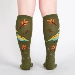 Fall foliage wraps around your leg in this olive green knee high. Quails, a ground-nesting bird are well qualified at camouflage. Take care not to step on any fine feathered friends when wearing these knee high socks, especially the baby bird hiding near the toes!
