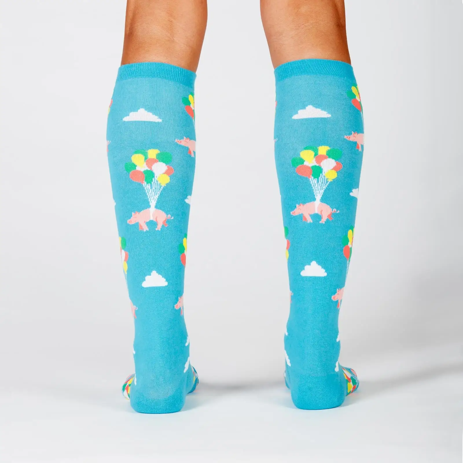 Mr. Pig could smell it in the air. He knew that his favorite food, which is any food, was just over the top of highest hill he could see, but there was no way his little piggy legs could get him alllll the way the there. The only way he could get to the smell’s source was to be inventive. So, he waddled his way to closest kid’s party, conveniently located at the neighboring farm, and wrapped himself in 24 brightly colored balloons. These floated him all the way to the most delicious feast he had ever had. Now we have these sunny knee high socks to commemorate the day.