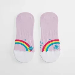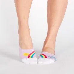 It takes both rain AND sun to make a rainbow appear. These no show socks have one sock with rain and one sock with sun, but both share the rainbow. Whether rain or sun, these socks have an optimistic, colorful point of view!
