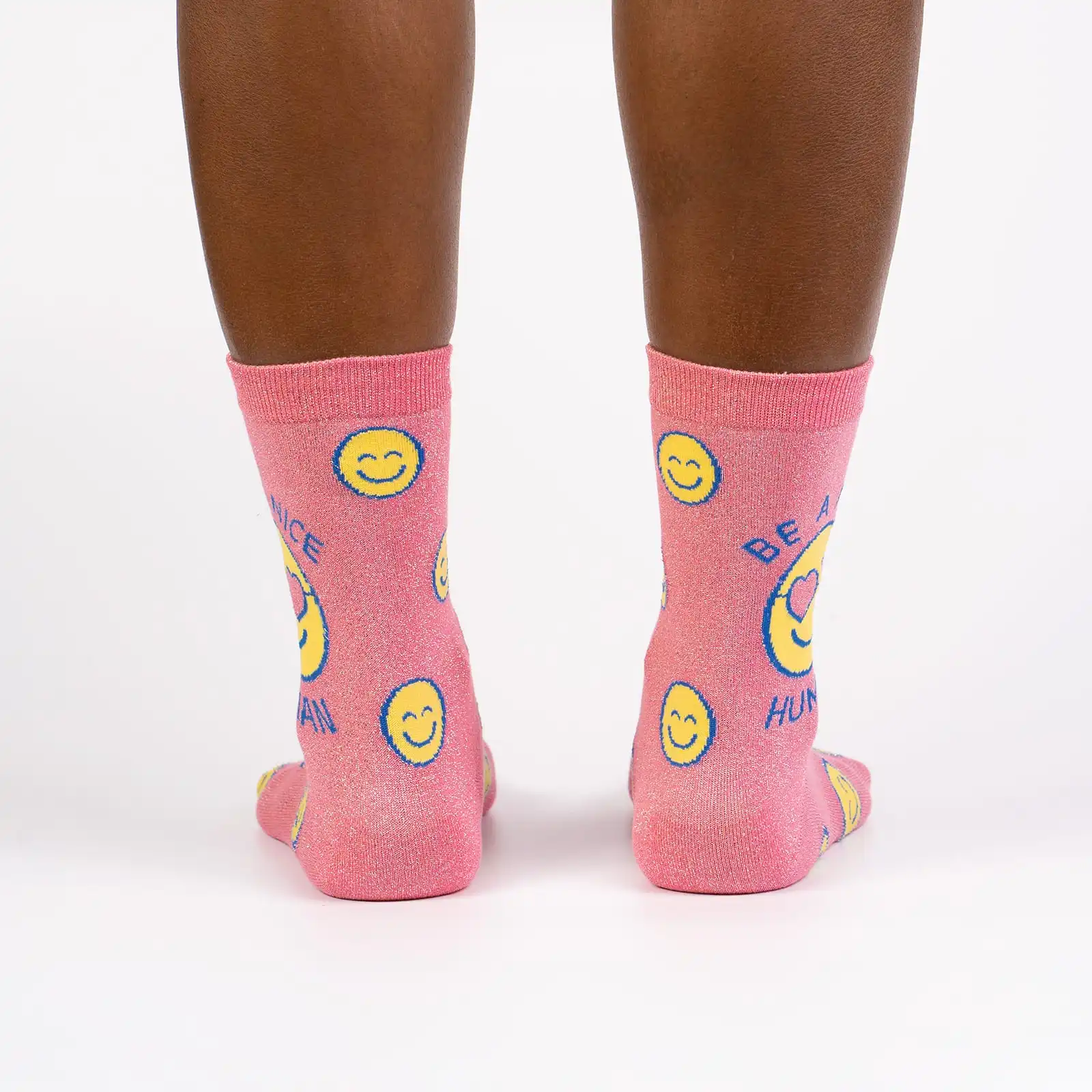 Be a nice human. That’s simple advice and it’s easy enough to follow, but the amazing part is the effect that it has. Being a nice human can rub off on someone who’s having a bad day, or it can inspire the next person to be a nice human too. If we all focused on being nicer humans, the world would be a much nicer place, wouldn’t it? Pass the message along with these positively delightful Be a Nice Human Crew Socks. They’re part of our Shimmer series, made with metallic threads that sparkle!