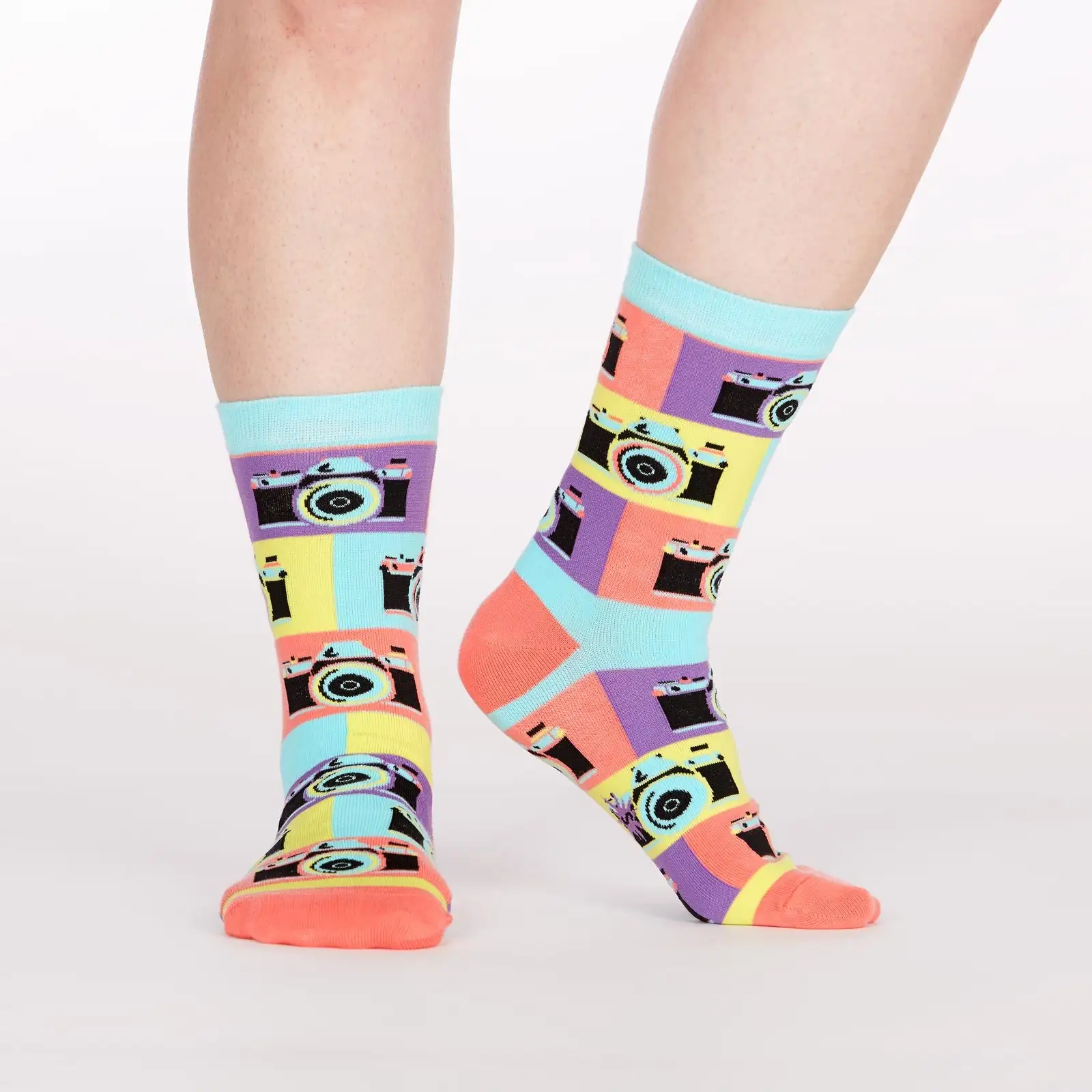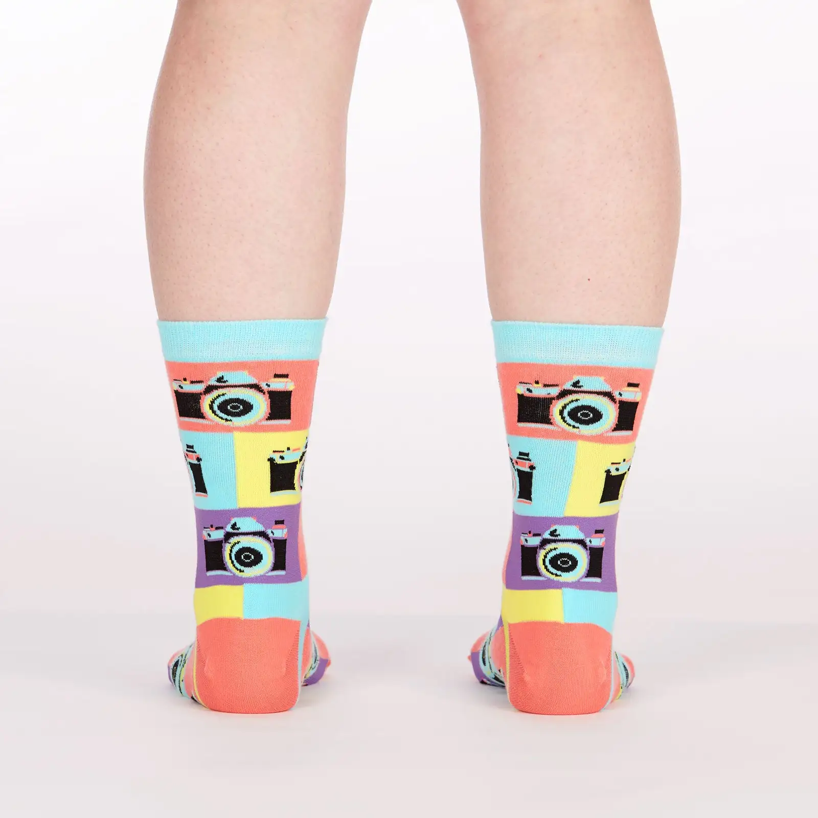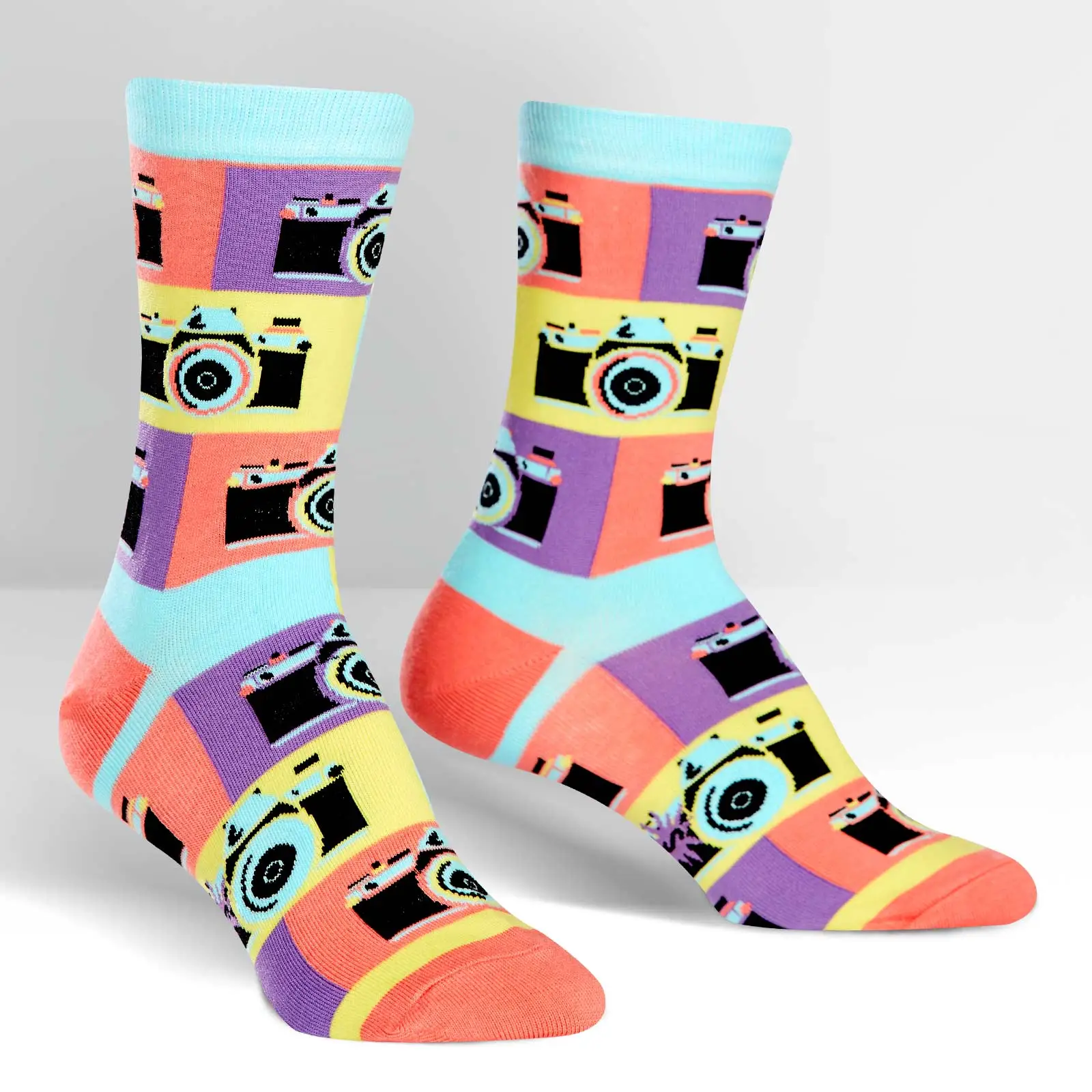 In this sock of art, we turned the camera on the camera! It’s really saying something about art itself, wouldn’t you agree? The camera FLASH. The POP of color. Everyone will be looking at your crew socks when you walk in the door to the next gathering.
