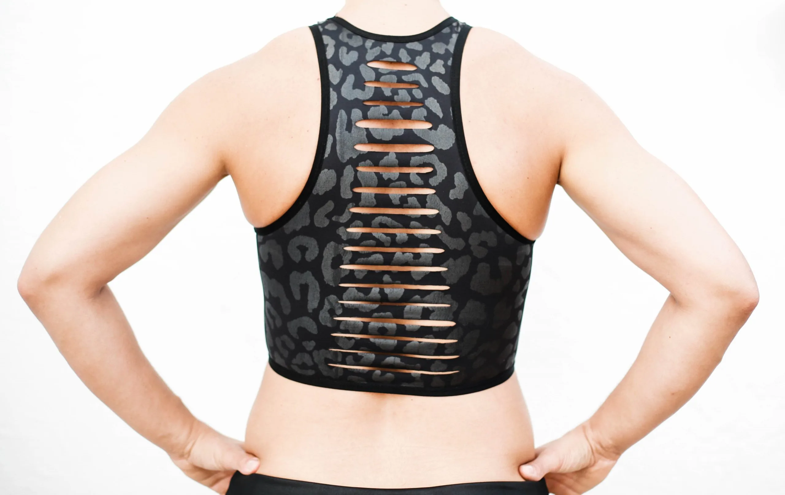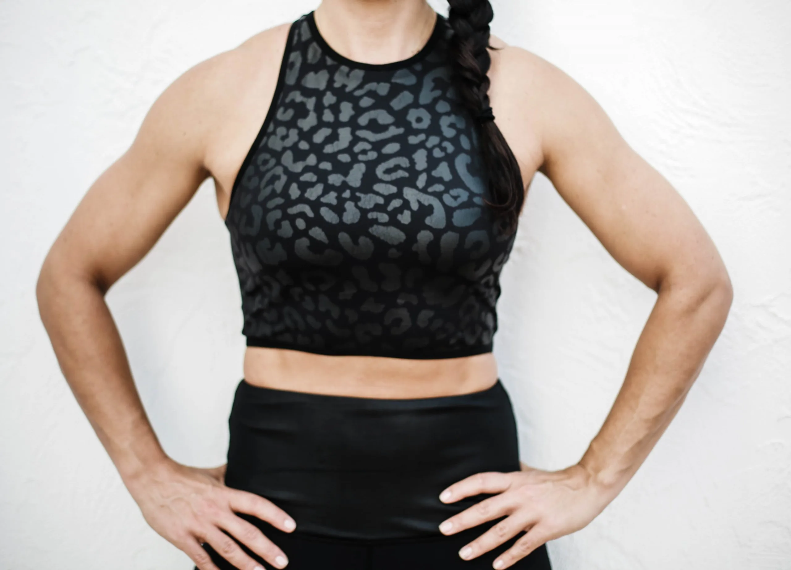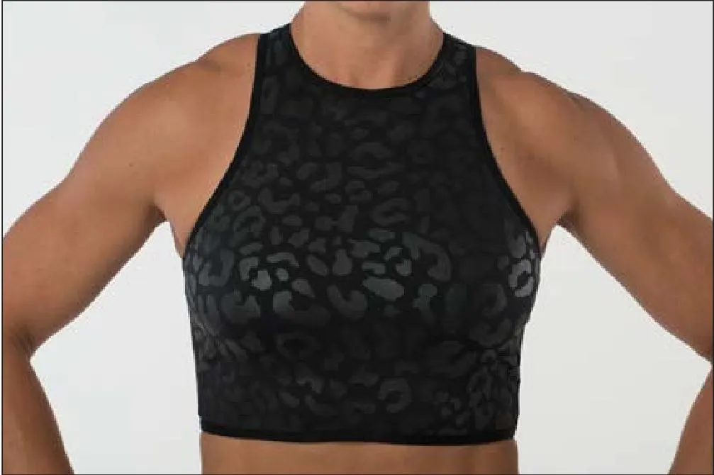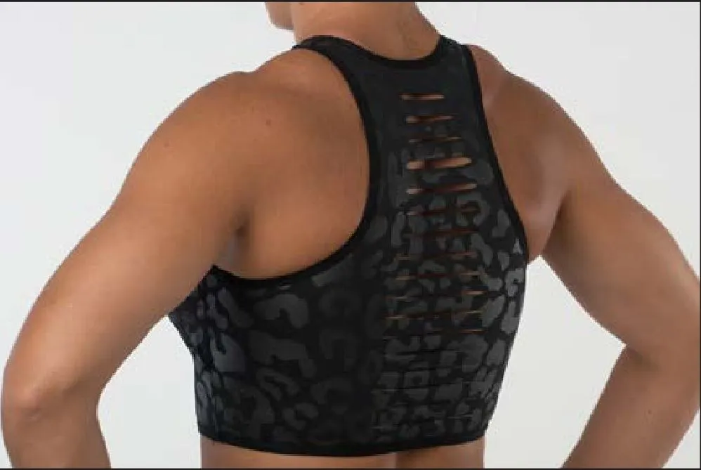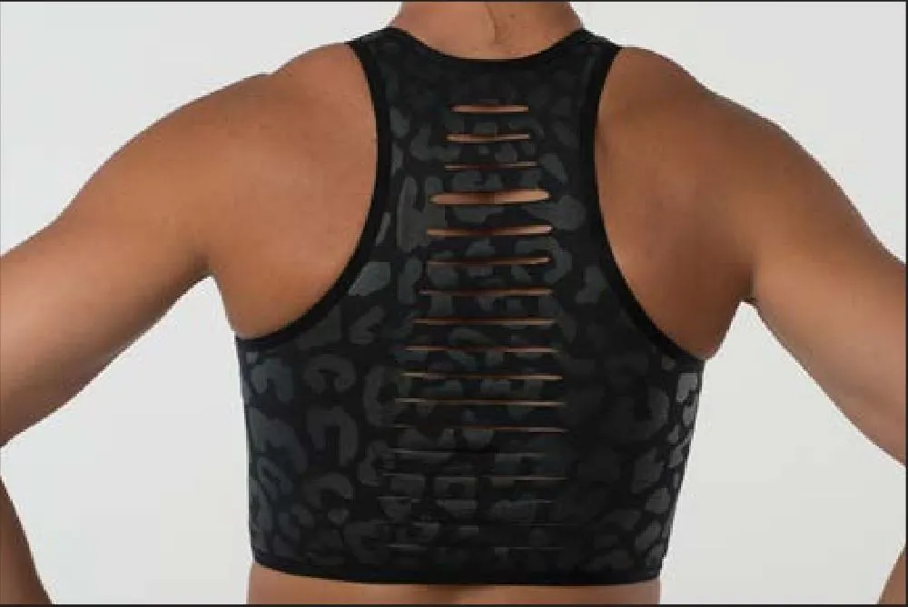 Finally, a Chestee crop! This one is in our High Impact collection and is our version of an athletic bralette. We took our custom leopard print and gave it a “subtle sporty touch” with a metallic tone-on-tone jet black coat. The built-in high intensity elastic rib band and hi-impact removable boob pads offer great coverage and extra support in the bust area.