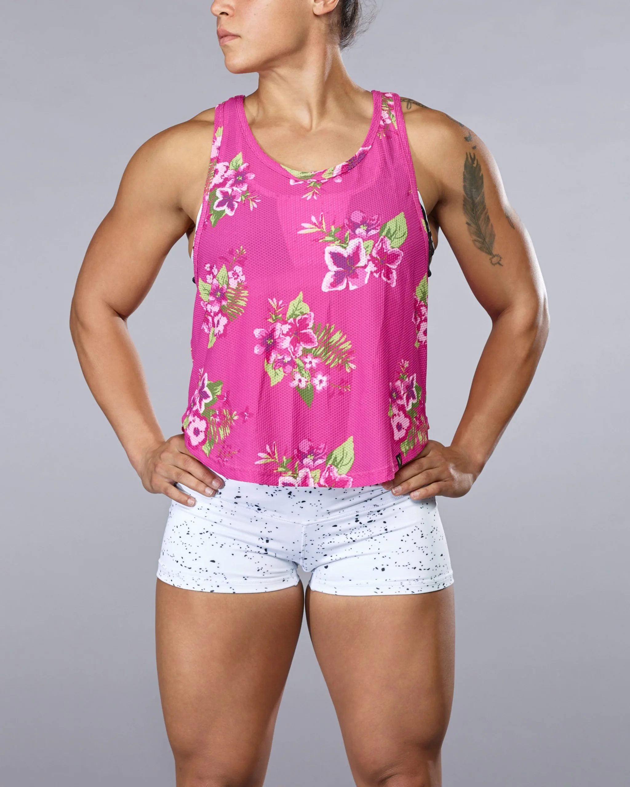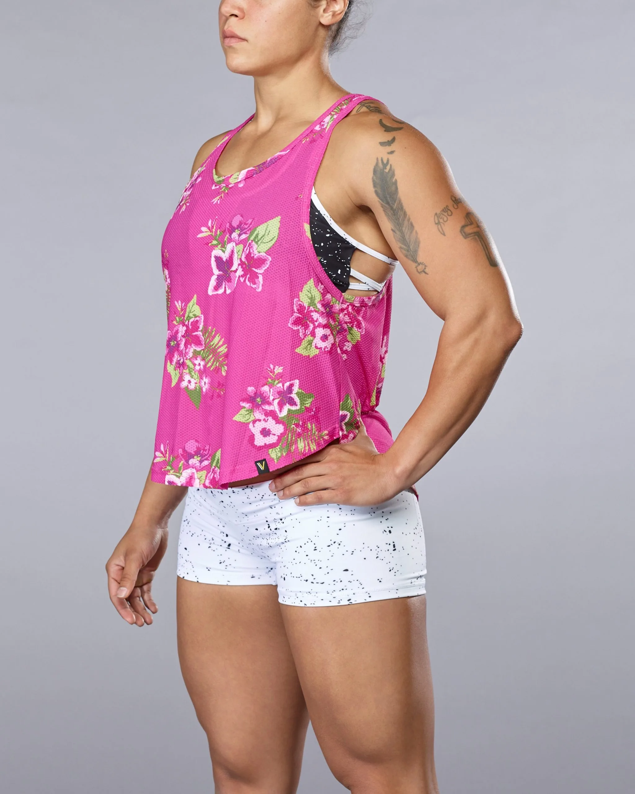 Extreme 4-way stretch makes up the body of this open and airy tank. Center back spine runs a lengthwise ladder cut binding for maximal breathability. Quick dry fabric that does not hold water or sweat! Traditional sew-over V logo at front right hip.