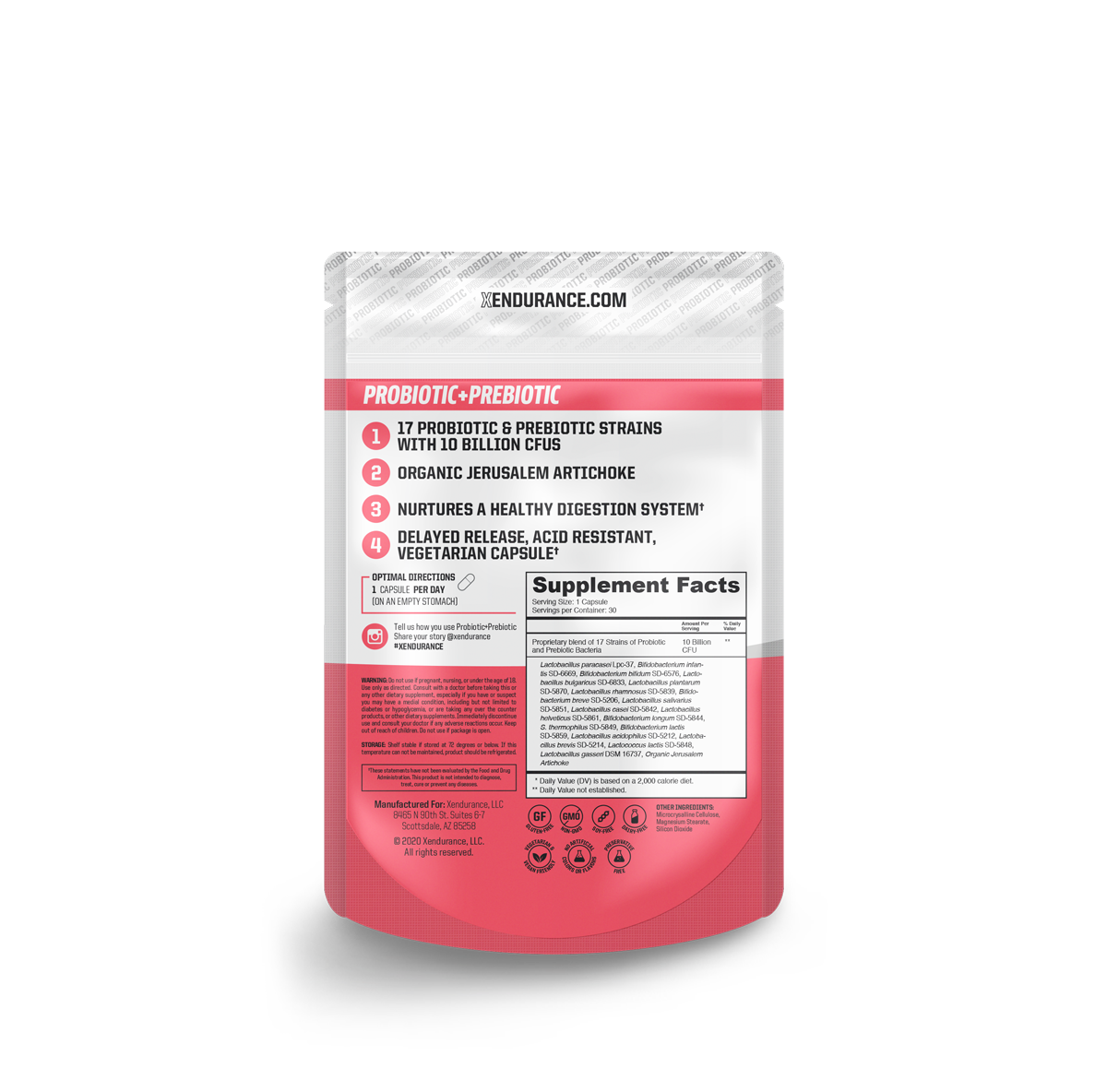 The Xendurance Probiotic & Prebioticis a diverse, 17 strain blend with 10 billion CFUs of known beneficial microbiome delivered in a vegetarian delayed-release, acid-resistant capsule.